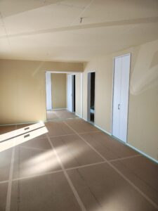 自社施工による木工事が順調に進み、フローリングと天井PBがきれいに施工されている様子が確認できました。 仕上がりが非常に美しく、丁寧な作業がしっかりと反映されています。